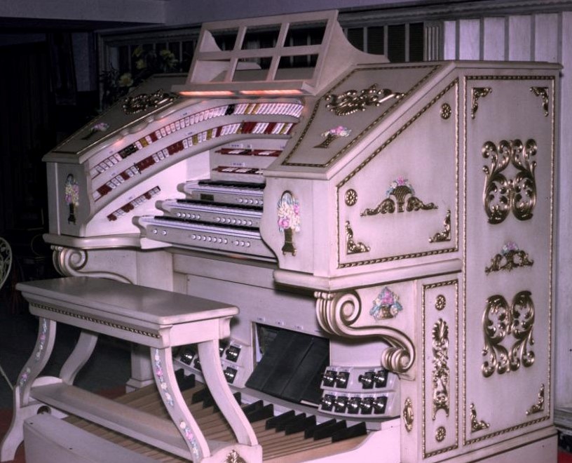 The Sadowski organ was by far the largest of the three Wurlitzer Style 260-inspired Rodgers organs. Bill Sadowski always considered George Wright’s early Hi-Fi recordings on the Vaughn 5-manual Wurlitzer as the best ever and wanted his organ to reflect that to the fullest extent organ electronics of the day could provide and then some. The console ornamentation was inspired from Bill and his wife’s love of their native Poland. They loved bright colors and flowers.