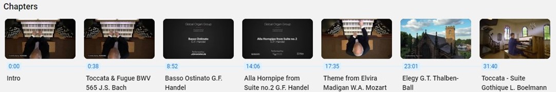 The video concert features Global Organ Group organs built by Rodgers, Johannus, Makin, and Copeman-Hart. Here is the playlist:
